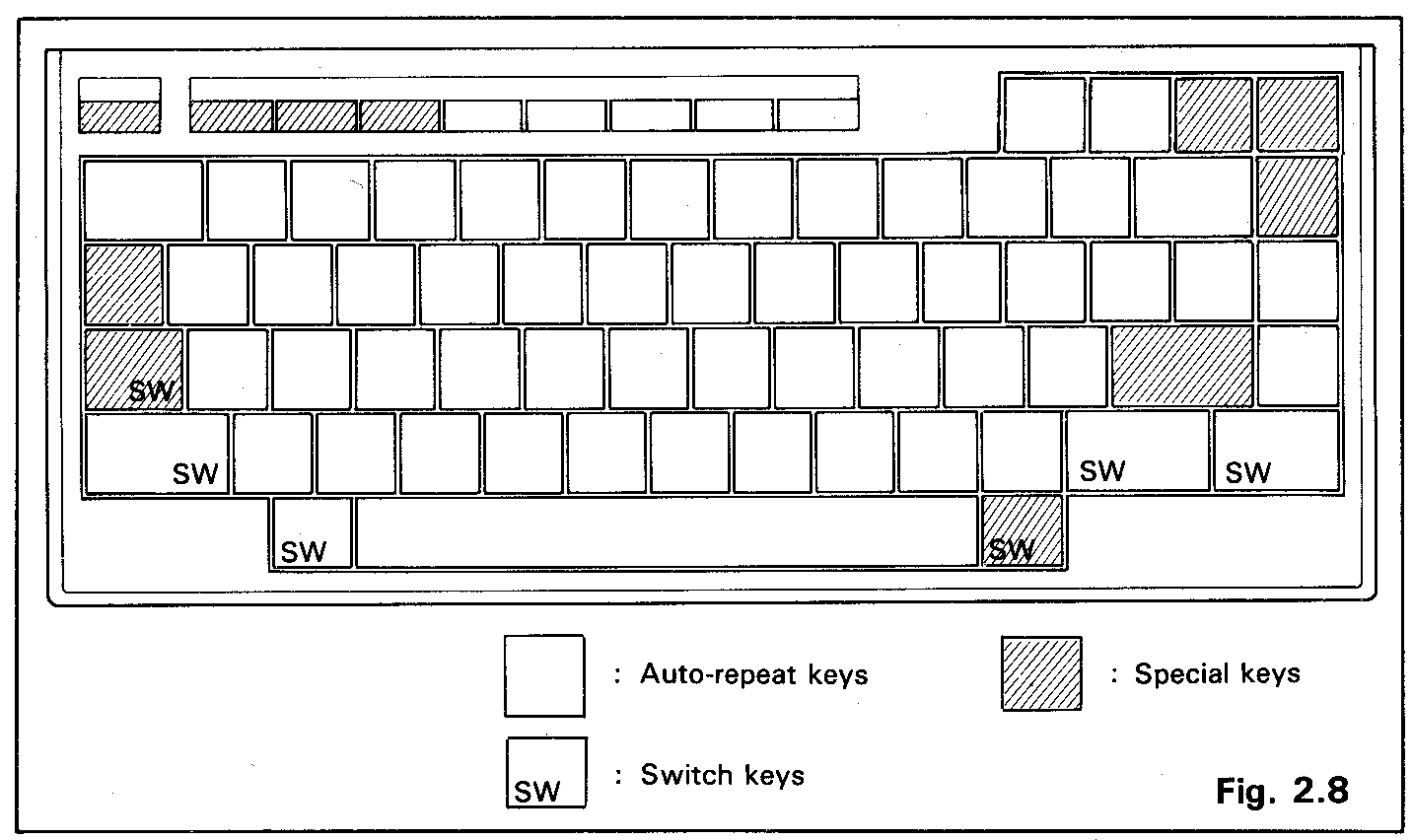 Most keys on the keyboard generate characters, alphabetic, punctuation and numerals or graphics characters. These keys are called auto-repeat keys. Each auto-repeat key generates a certain character code repeatedly if it. is pressed and held on for more than a specified period of time. This normally causes a charac-ter to be printed on the screen. Some keys are switch keys which alter the charac-ter code output by the character keys, for example to allow one key to output either upper or lower case characters. Other keys are special keys which allow insertion and deletion of characters, for example.