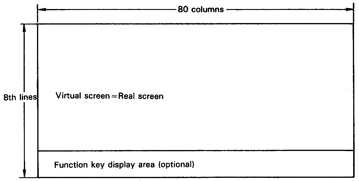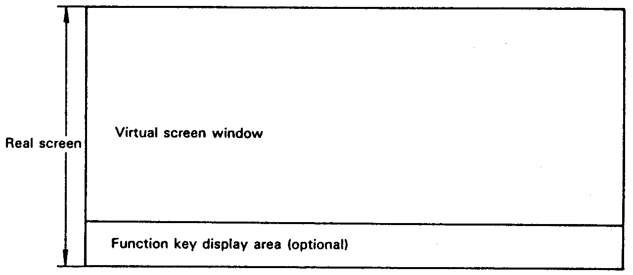 When you view the LCD screen of the PX-8, you are looking at a window on a much larger screen. The screen displayed on the LCD is known as the real screen. This is 8 lines high by 80 columns. The operating system works with a much larger screen, a screen of up to 40 lines and 80 columns. The real screen then displays a window on this larger screen (the virtual screen), which is called the virtual screen window.