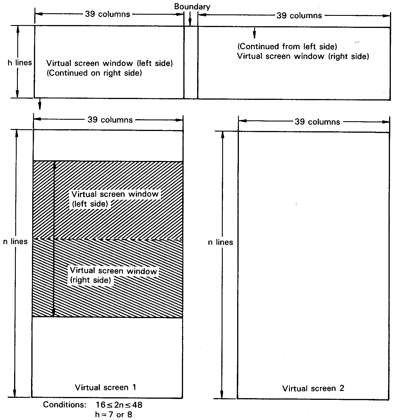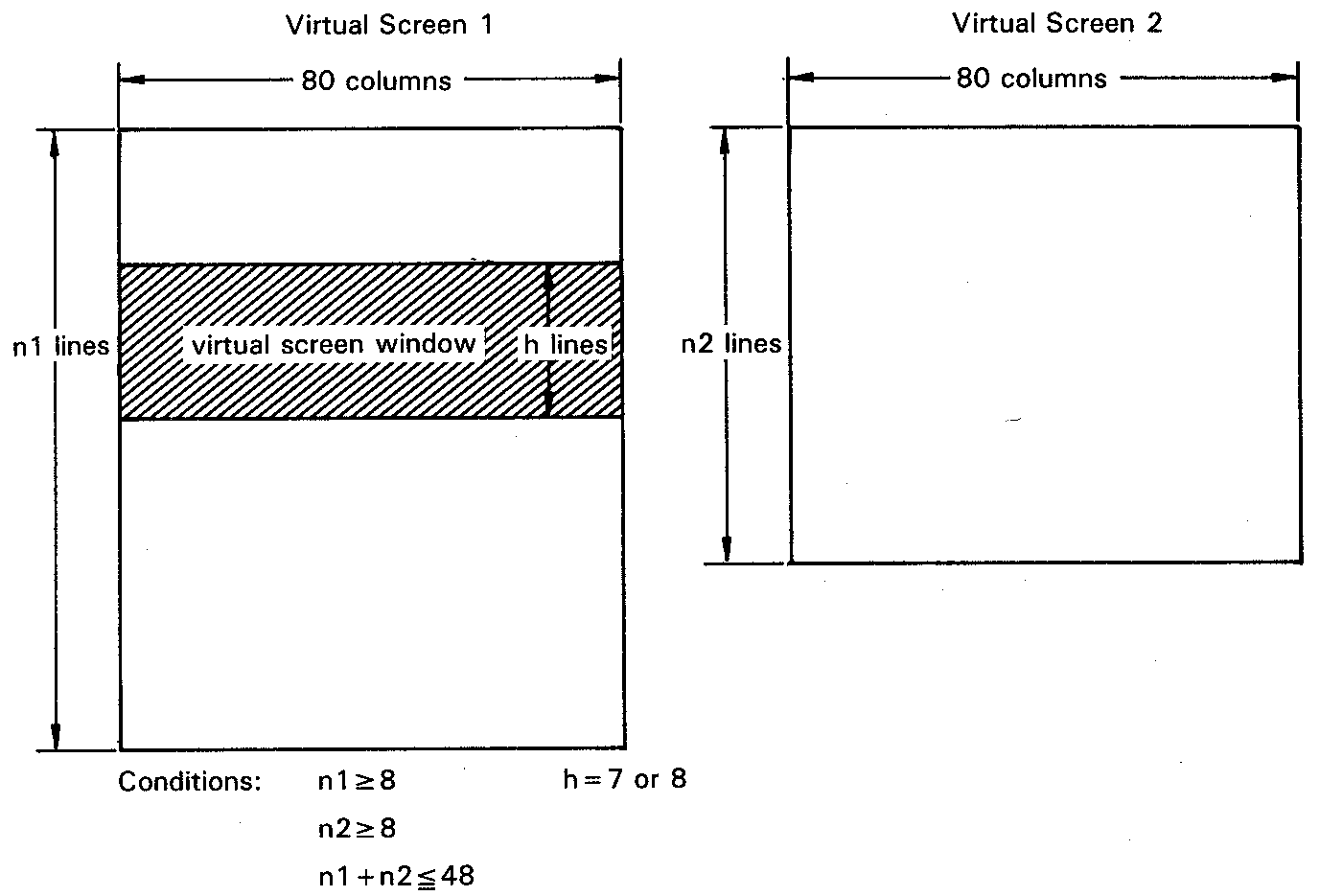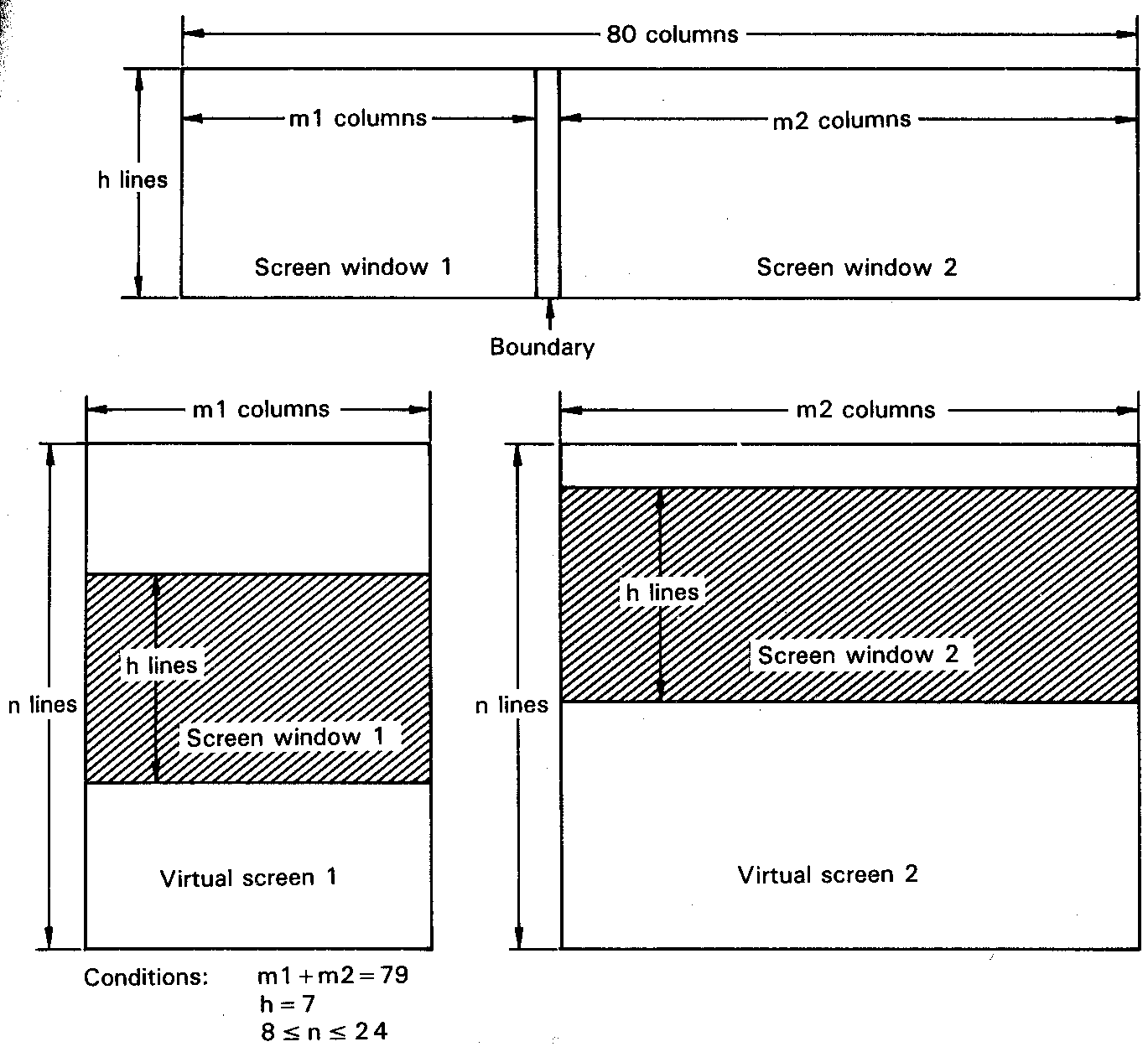 The number of lines of the two virtual screens must be in the range 8 to 48, and must be the same in both virtual screens. The number of columns and the boundary character can be set by the user. The totalnumber of columns must equal 79, and there must be at least one column in one of the screens. The CON-FIG program described in Chapter 3, can be used to set these parameters.