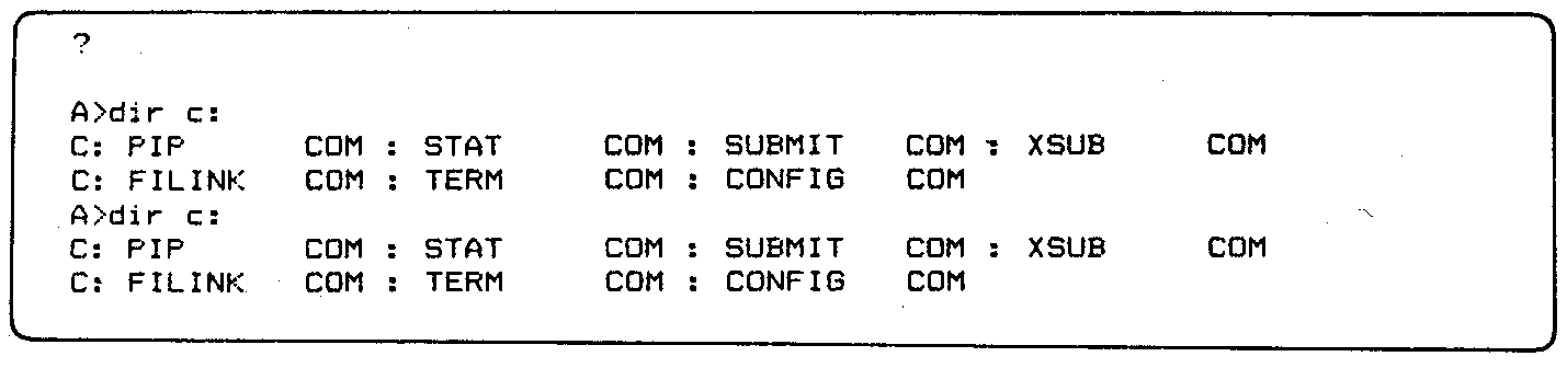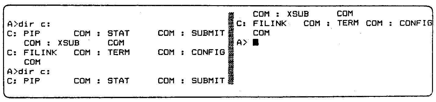 If the sequence of clearing the screen and printing two directories of the C: drive is performed with screen 1 turned on (it can be chosen by using the CON-FIG program described in Chapter 3), then the screen will show the following output.