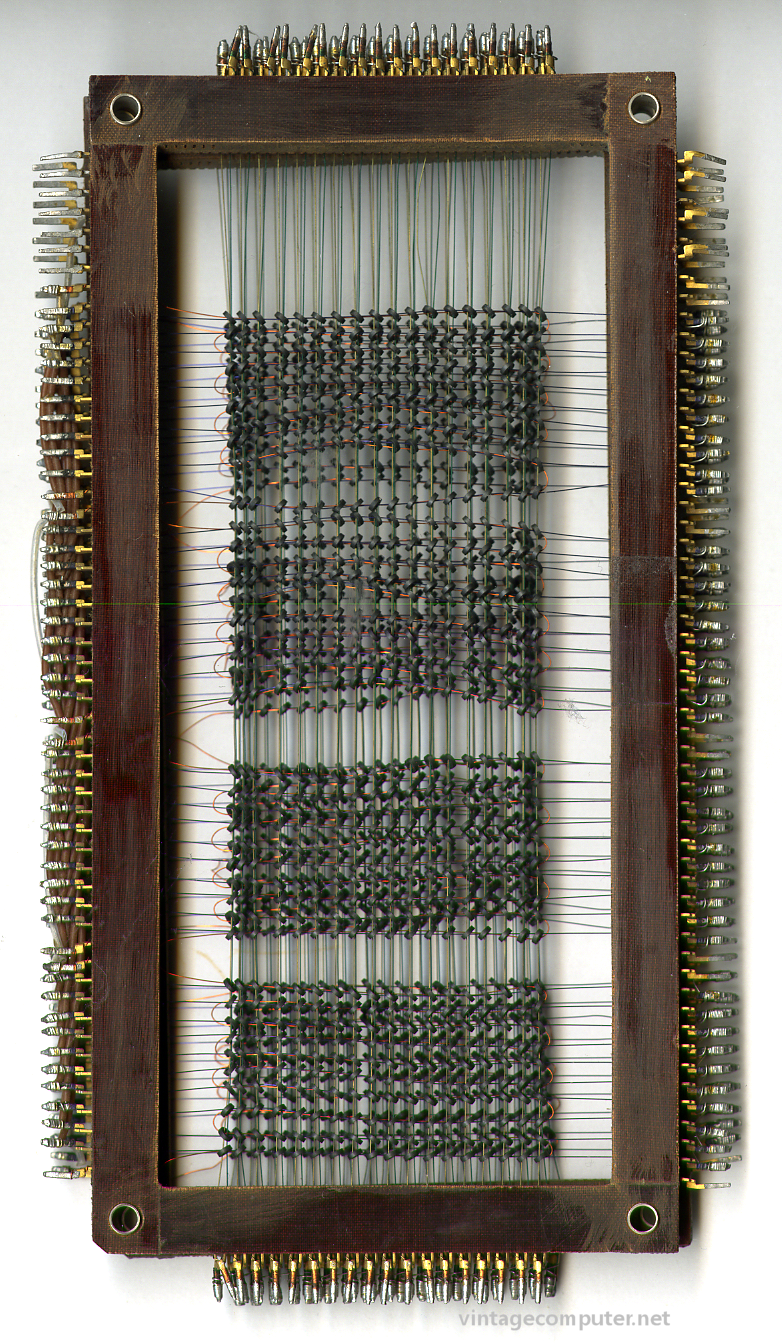 UNIVAC core memory. UNIVAC 418 era. This is a piece of a core module full of many of these to make up one contiguous memory space. This core is a fraction of a core module of maybe 4K or 8K. Each magnet is a bit. Click image for larger view.