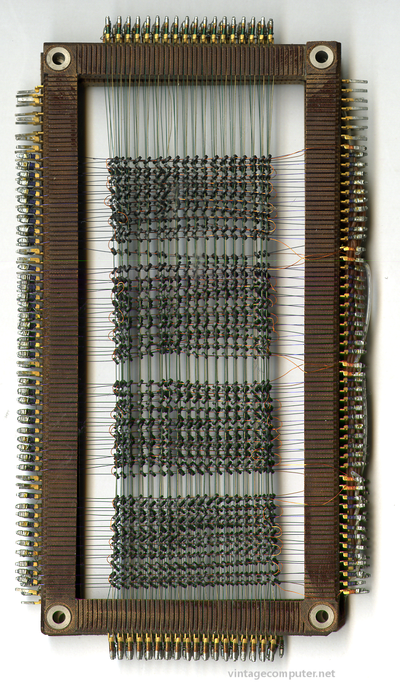 UNIVAC core memory. UNIVAC 418 era. This is a piece of a core module full of many of these to make up one contiguous memory space. This core is a fraction of a core module of maybe 4K or 8K. Each magnet is a bit. Click image for larger view.